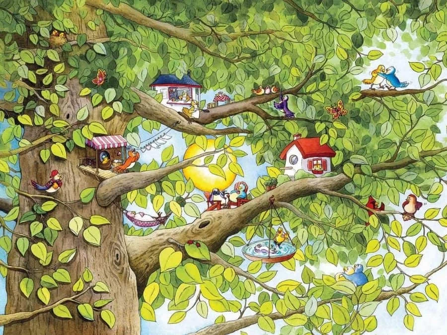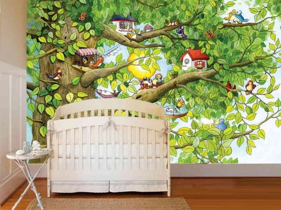 Bird Tree Wallpaper adds a splash of cuteness with its birds frolicking in their treehouse. Your kids will want to take wing with these chicks as they hang laundry, cook for a picnic and take a bird bath among the green leaves. Created from an original painting by a Canadian artist, it’s scanned at high resolution capturing the texture of the paper and the brushstrokes in the paint. It’s: