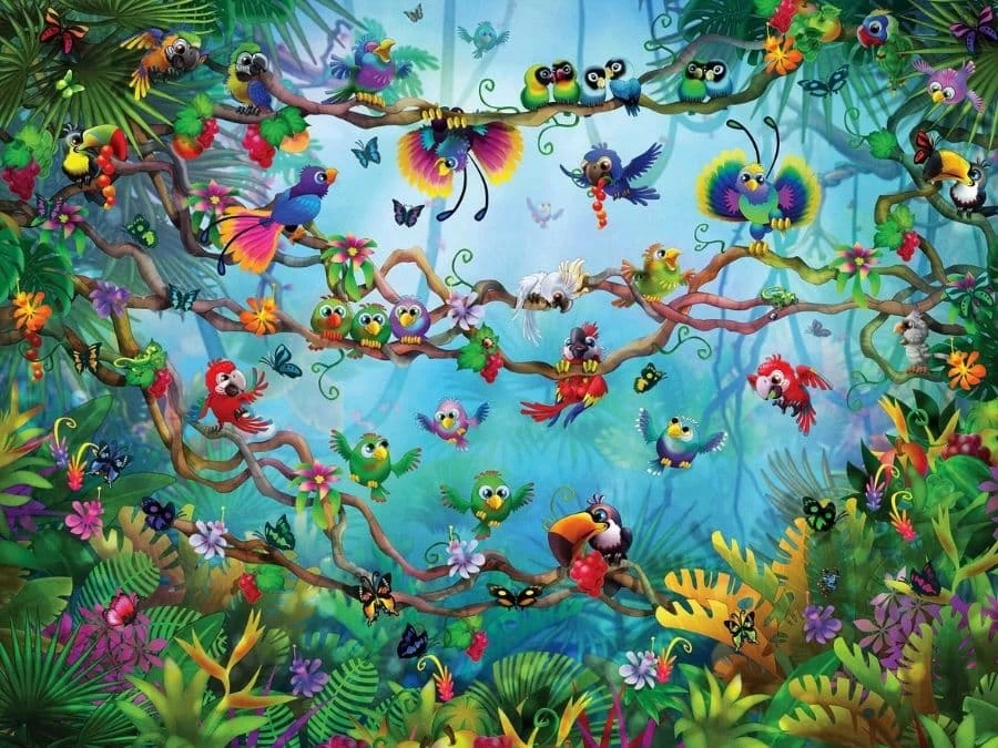 Birds Paradise Wall Mural creates a colourful, lush oasis for your kids to grow and play. Children love making up names for each tropical parrot, toucan, cockatoo and butterfly in this rainforest scene. This cute bird wallpaper is a computer illustrated masterpiece of an exotic jungle full of flowers, ferns and foliage. It’s: