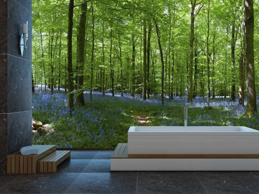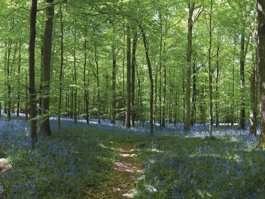 Bluebell Forest Wallpaper is peaceful with a gentle carpet of blue bell flowers under fresh spring trees. This forest wallpaper is created from a photo of a serene hiking trail winding through newly budded trees. It makes your room feel bigger as the forest mural adds depth – you feel like you can step right onto the walking path. It’s the perfect way to add a touch of nature to a forest themed bedroom, living room or nursery. It’s: