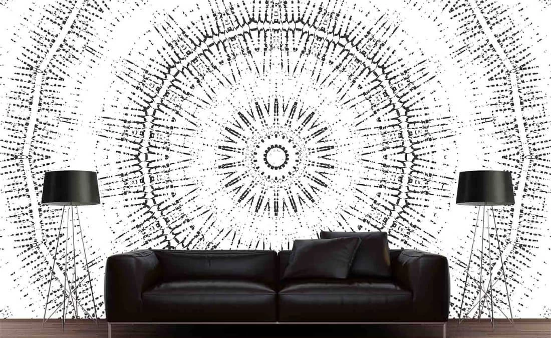 Circle Wallpaper adds simple texture to walls with its black and white kaleidoscope pattern. Created from a digital illustration, the small shapes in this geometric design are arranged in one large circle. It looks like a modern version of a mandala and is: