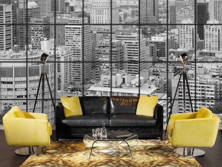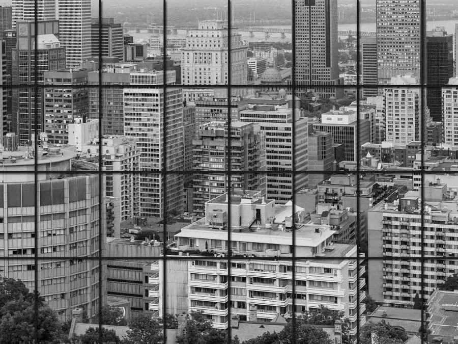 City Window Wallpaper adds an exciting feeling to walls with its view of downtown Montreal from a condo on Mount Royal. Created from a high resolution photo, taken by a Canadian photographer, it captures the skyline full of high rise buildings and skyscrapers from behind faux window panes. It feels like you’re looking out of a balcony window. This mural is: