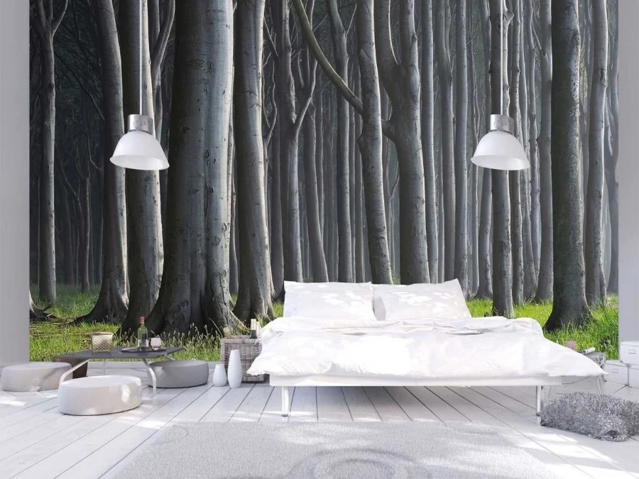 Dark Forest Wallpaper adds a feeling of mystery to walls with its black beech trees against a dark background. Created from a photo, it captures the beautiful trees with gray textured bark standing in a green grass field. It almost looks like an enchanted forest. It’s: