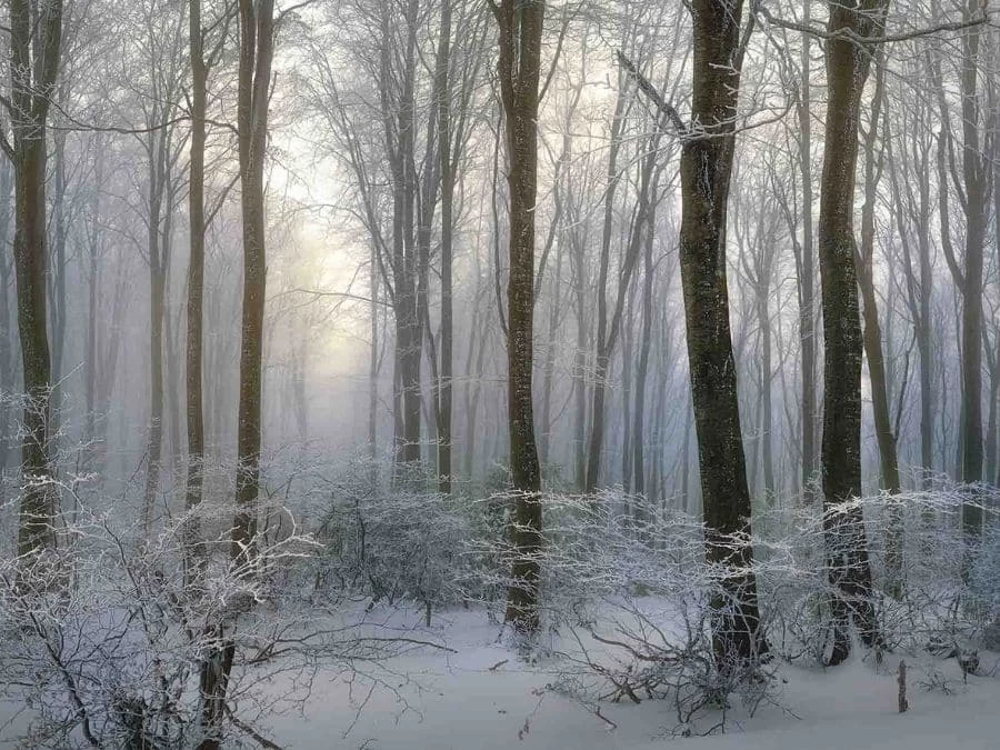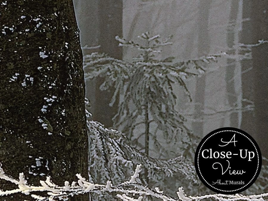 Dark Winter Forest Wallpaper creates mysterious walls with its winter scene against a foggy background. Created from a photo, it captures ice covered foliage over a carpet of snow. Tall thin trees sit still in the grey mist of the snowy woods. This winter wall mural is:
