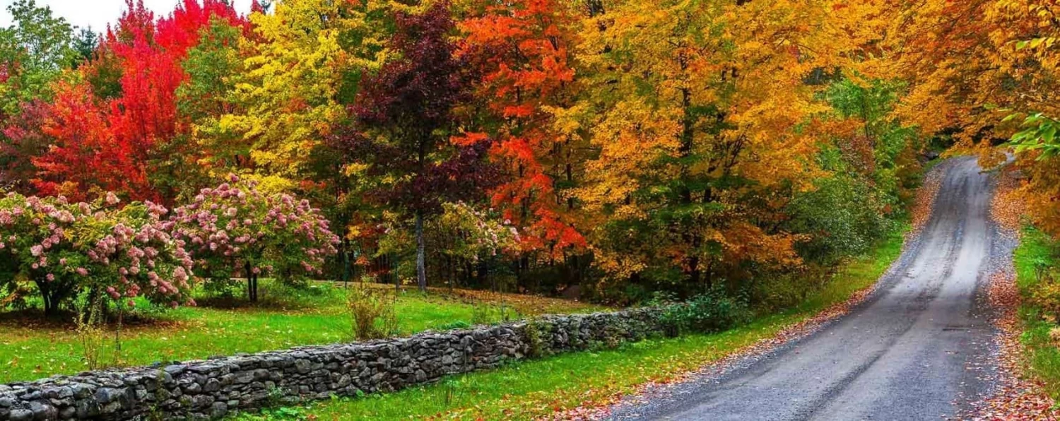 Fall Road Wallpaper adds a warm feeling to walls with its gravel lane sloping under red and orange trees. Created from a photo taken by a Canadian photographer, it captures a stone wall running the length of a country road and grassy field near a pink hydrangea bush. It’s perfect to hang over a chair rail or wainscoting. This nature mural is:
