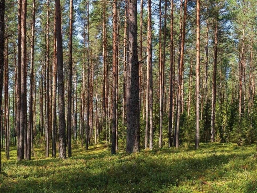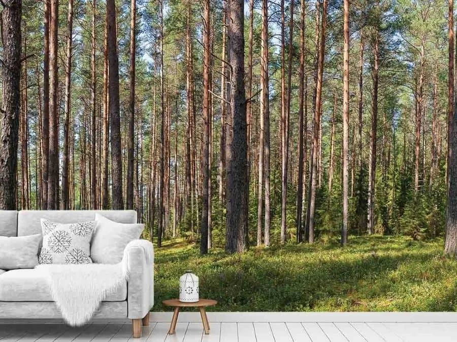 Fir Wallpaper creates beautiful walls with its panoramic fir forest of tall green trees against a blue sky. Created from a photo, it captures pine trees shaded by tall, rugged fir trees with exposed bark and branches on a carpet of leafy foliage. You can almost smell the aromatic scent of the pine needles in the tall trees wallpaper. It’s: