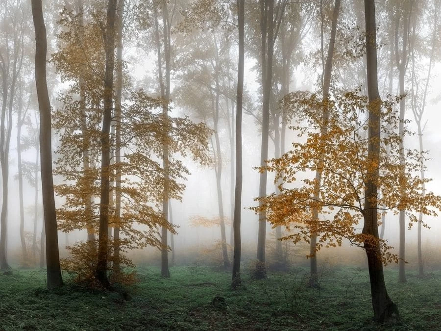 Foggy Autumn Wallpaper adds a mystical feeling to walls with its view of an autumn foggy forest, Balkan Mountains, Bulgaria. Created from a photo, it captures yellow trees backlit by a fall fog. You’ll want to step into this landscape and stroll through the green foliage. This wall mural is: