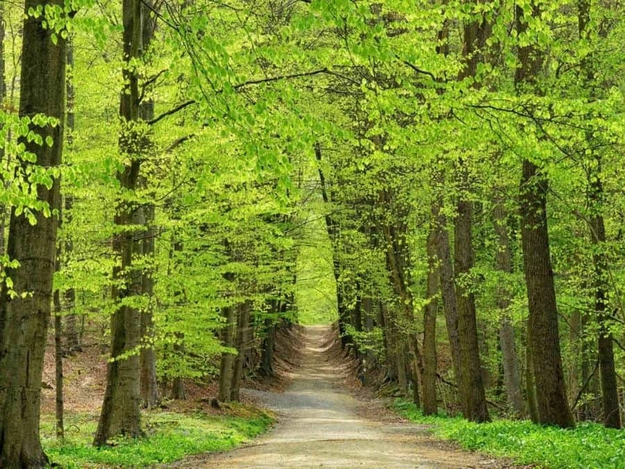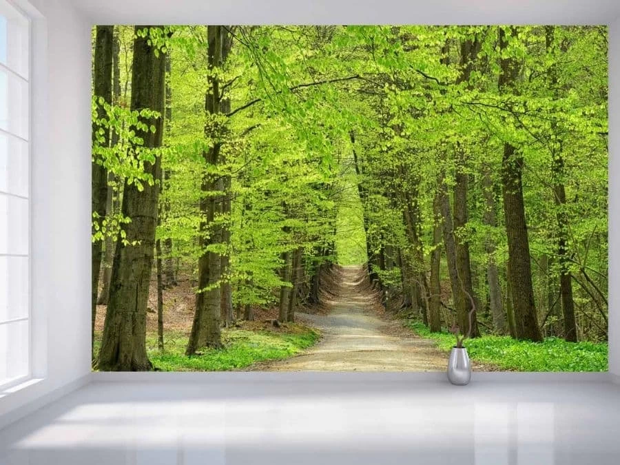 Footpath Wallpaper creates serene walls with its view of a passage into a spring forest. Created from a photo, it captures a trail leading under a canopy of freshly budded trees. The arch of yellow-green leaves feels fresh. Youâll want to step into this nature mural and walk the path, breathing the fresh air. Itâs: