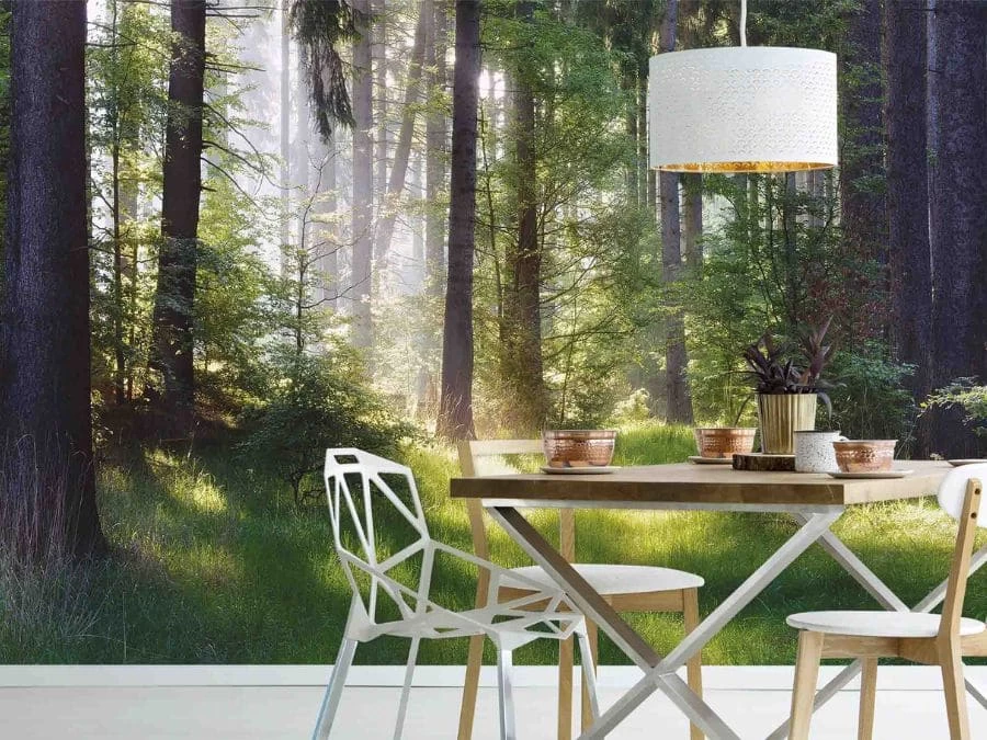 Forest Grass Wallpaper adds a serene feeling to walls with its sun rays shining through a green forest onto tall, wispy grass. Created from a photo, it captures the sunbeams illuminating majestic pine trees. You’ll almost smell the musky sap in the woodland scene. This wall mural is: