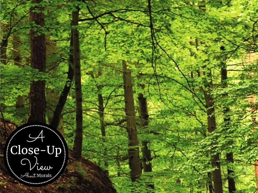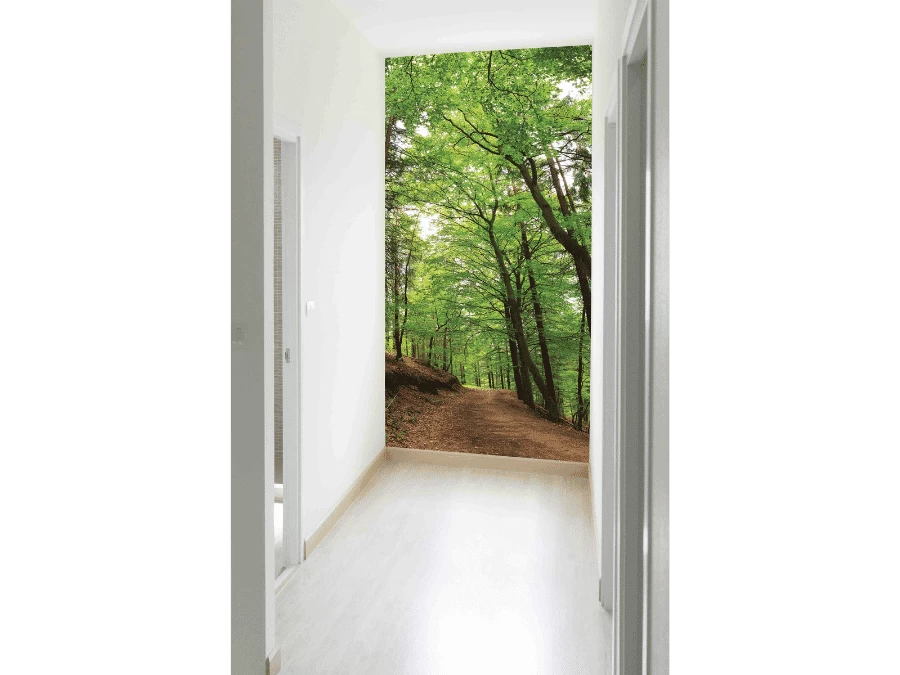 Forest Path Wallpaper creates a peaceful feeling room with its hiking trail winding under green trees. This forest wallpaper is created from a photo of a wooded area in the Bohemia region of the Czech Republic.