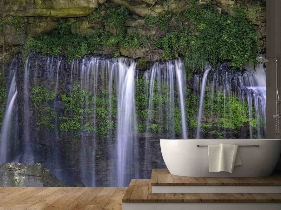 Forest Waterfall Wallpaper adds a beautiful feeling to walls with its view of Upper Balls Falls, Lincoln, Ontario. Created from a high resolution photo by a Canadian photographer, it captures water showering through rock crevasses over green foliage on the side of a mountain. This wall mural is: