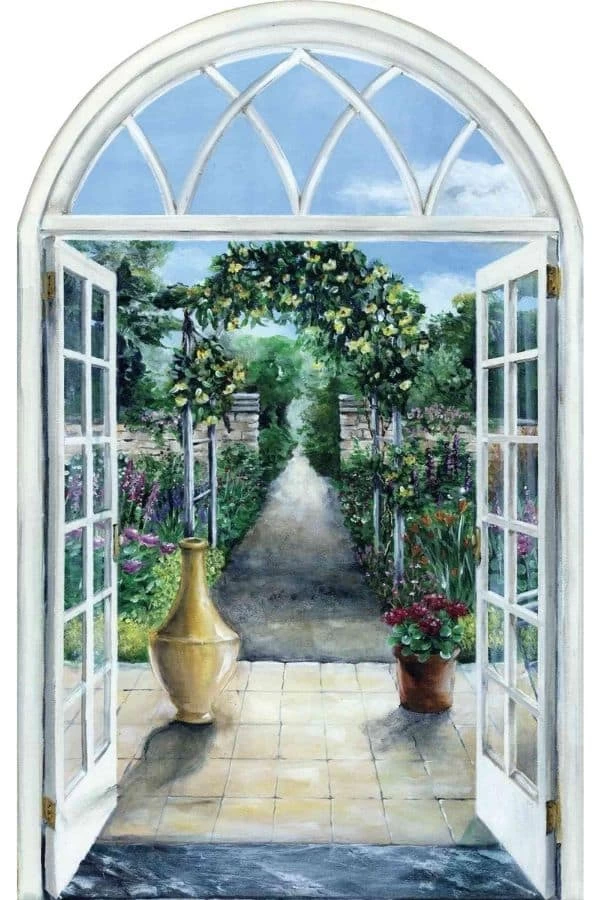 Garden Path Wallpaper adds a beautiful feeling to walls with its view of a door to the garden. Created from a painting by a Canadian artist, it captures doors opening to a stone walkway leading under a floral arch, plants and flowers. Terracotta pots line the entrance and offer an Italian feel. This mural is: