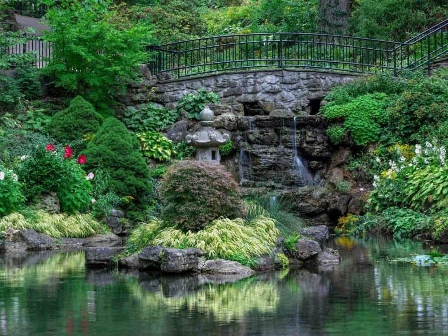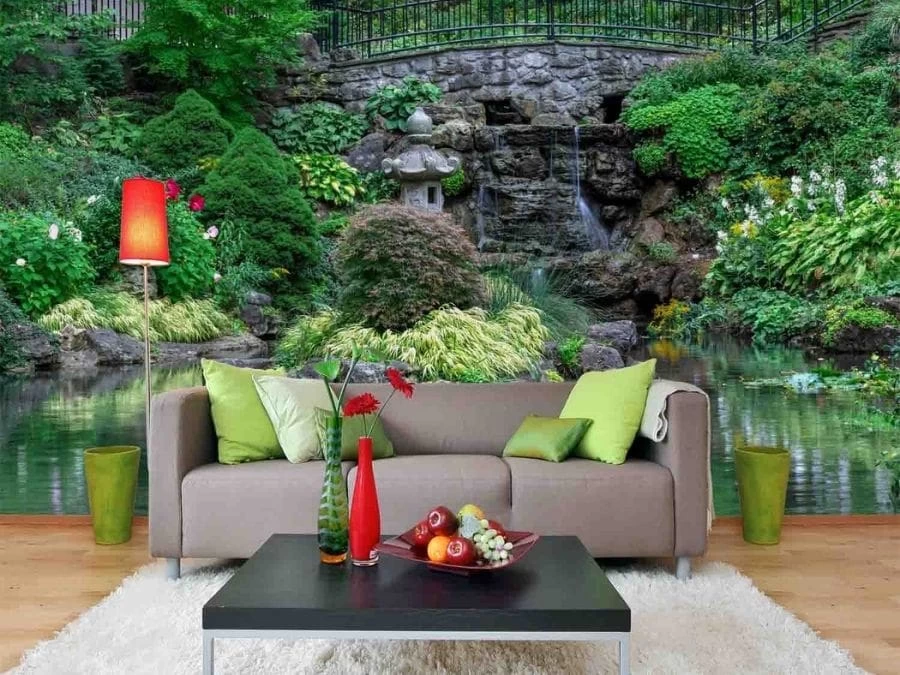 Garden Pond Wallpaper adds a peaceful feeling on walls with its view of a garden in High Park, Toronto. Created from a high resolution photo taken by a Canadian photographer, it captures a black wrought iron fence over a small waterfall. A zen pagoda statue sits among the landscaping of plants, flowers and small trees, all reflected in the still water. This mural is: