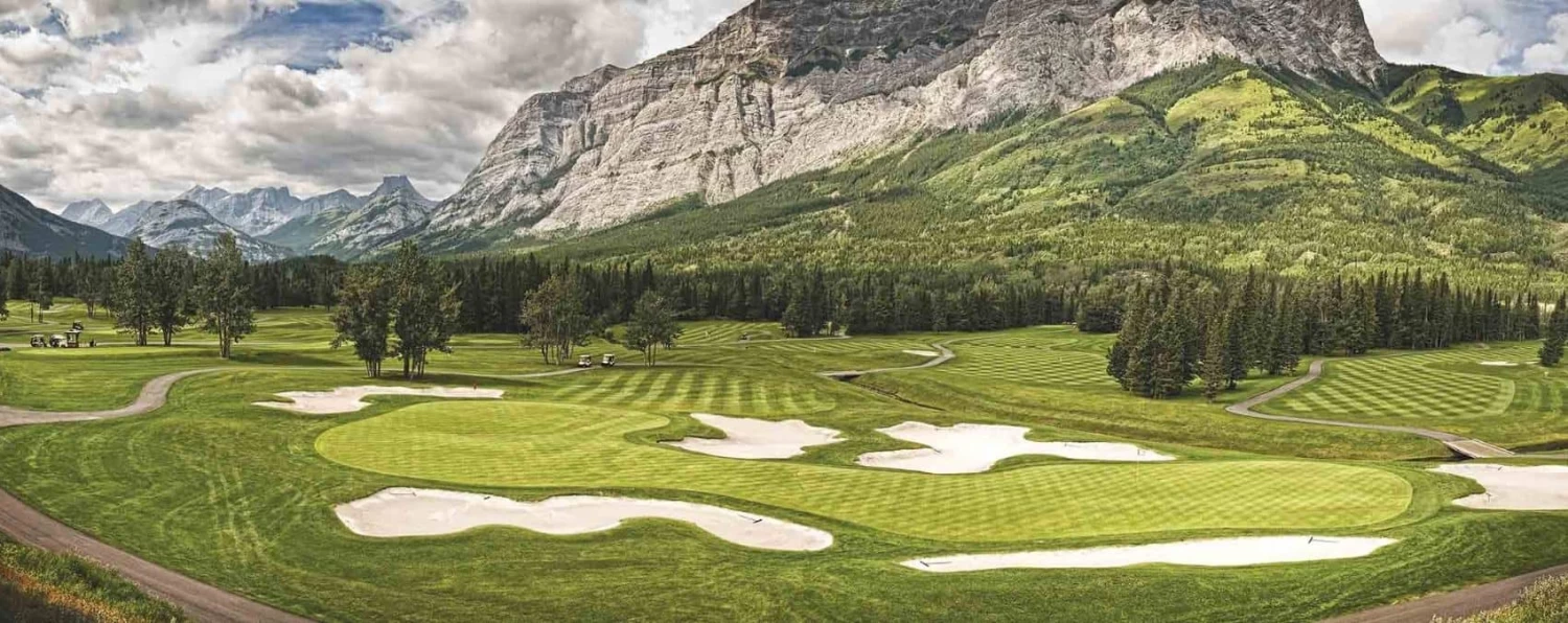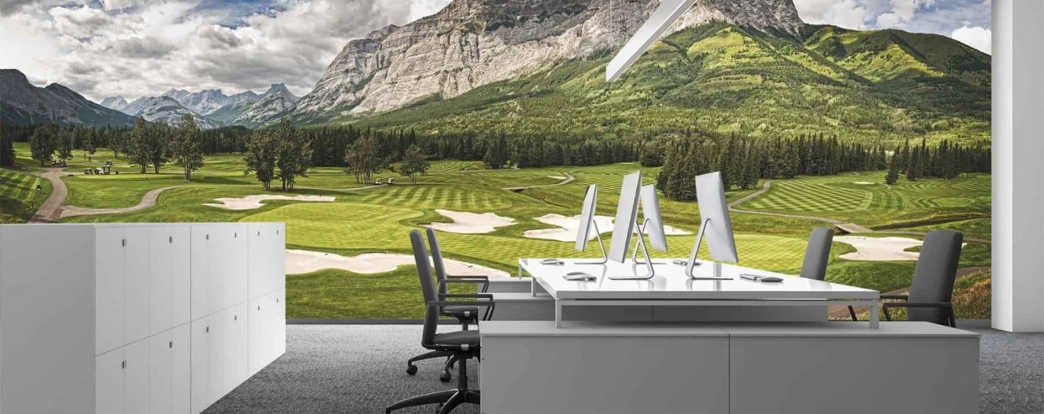 Golf Course Wallpaper is a stunner and perfect for those who dream of golf in the mountains. Created from a photo, it captures the Mount Kidd course at Kananaskis Country Golf Course in Alberta, Canada. The extra wide mural is perfect for wrapping around two, three or even four walls. Golfing buddies will be in awe of this gorgeous scene, with its mountain towering over bunkers, pristine greens dotted with pine trees and cart path. It’s: