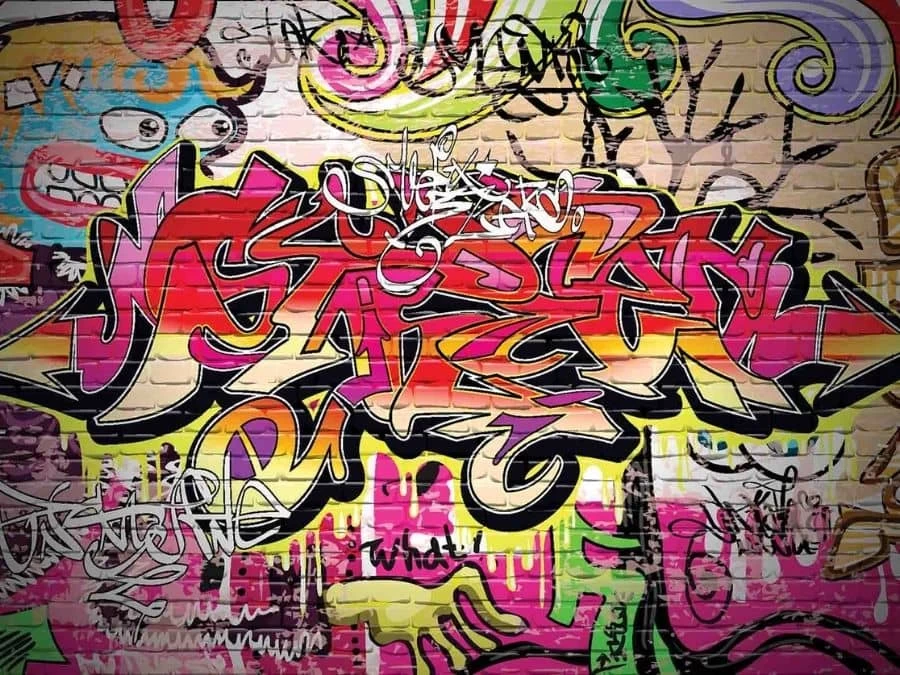 Graffiti Brick Wallpaper adds a cool vibe to walls with its urban art on a brick wall. Created from a digital illustration that’s super crisp and clear, it captures a face and words in a wildstyle with interwoven and overlapping letters and shapes, making it illegible. This wall mural is: