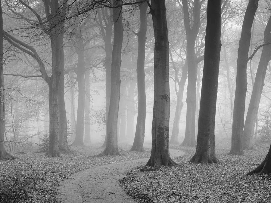 Gray Forest Wallpaper creates mysterious feeling walls with the winding path under tall, leafless trees. Created from a photo, it captures the foggy mist settling in the background of this nature scene. A black and white filter is added, offering a cool mood. It’s: