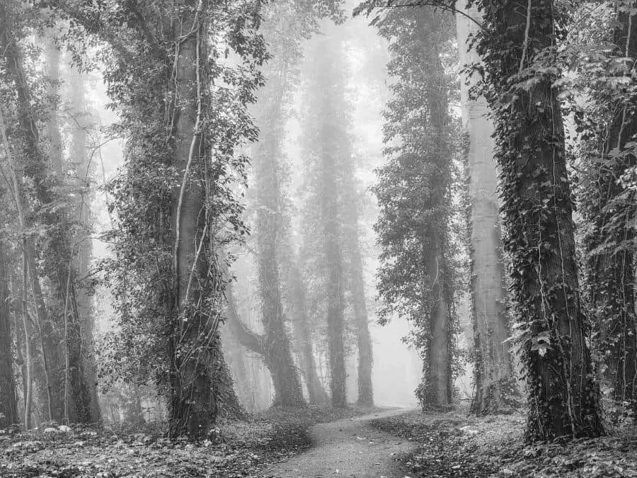 Gray Nature Wallpaper adds a mystical feeling to walls with its view of a path winding under vine-covered trees in a misty forest. Created from a photo with a black and white filter added over top, it captures all the texture from the leaves peppering the landscape scene. This trail wall mural is: