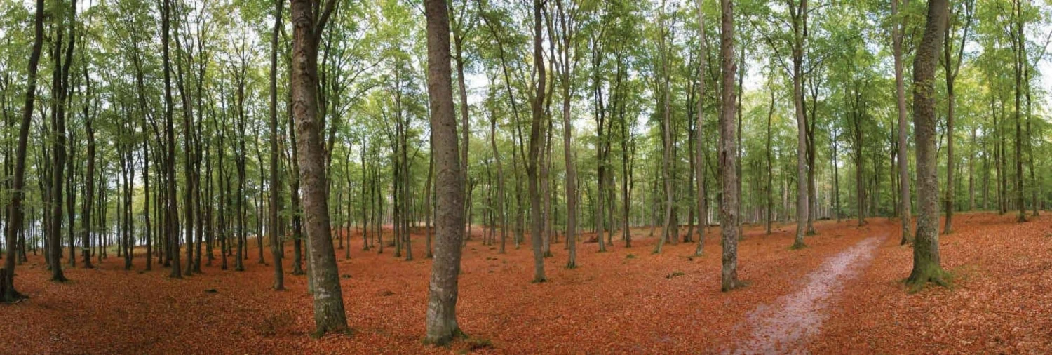 Green Fall Wallpaper adds a natural feel to walls with its view of dried orange leaves on an autumn forest floor. Created from a photo, it captures a path running under green trees. The panoramic size of this wall mural is perfect for one large wall or to wrap onto two, three or four walls. It’s: