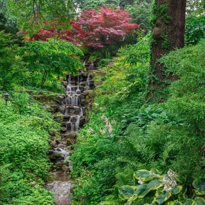 Green Waterfall Wallpaper adds a beautiful feeling to walls with its view of waterfalls, High Park, Toronto, Canada. Created from a high resolution photo by a Canadian photographer, it captures a layered waterfall cascading down rocks next to trees, plants and foliage. This wall mural is: