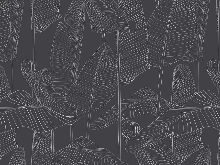 Grey Banana Leaf Wallpaper creates exotic feeling walls with its banana leaves in grey. Created from a digital illustration, this tropical wallpaper features silhouettes of big leaves on a dark gray background. It’s: