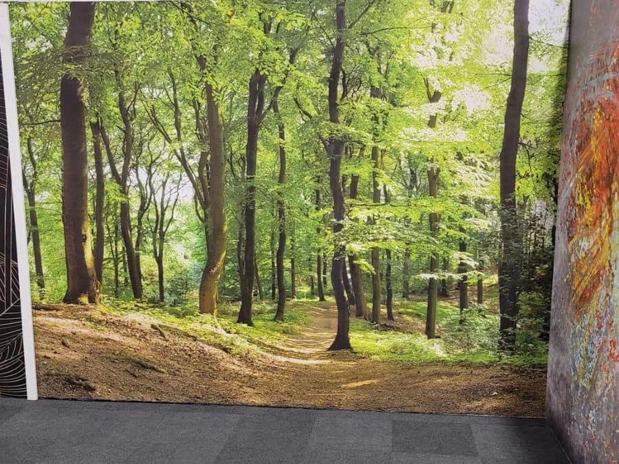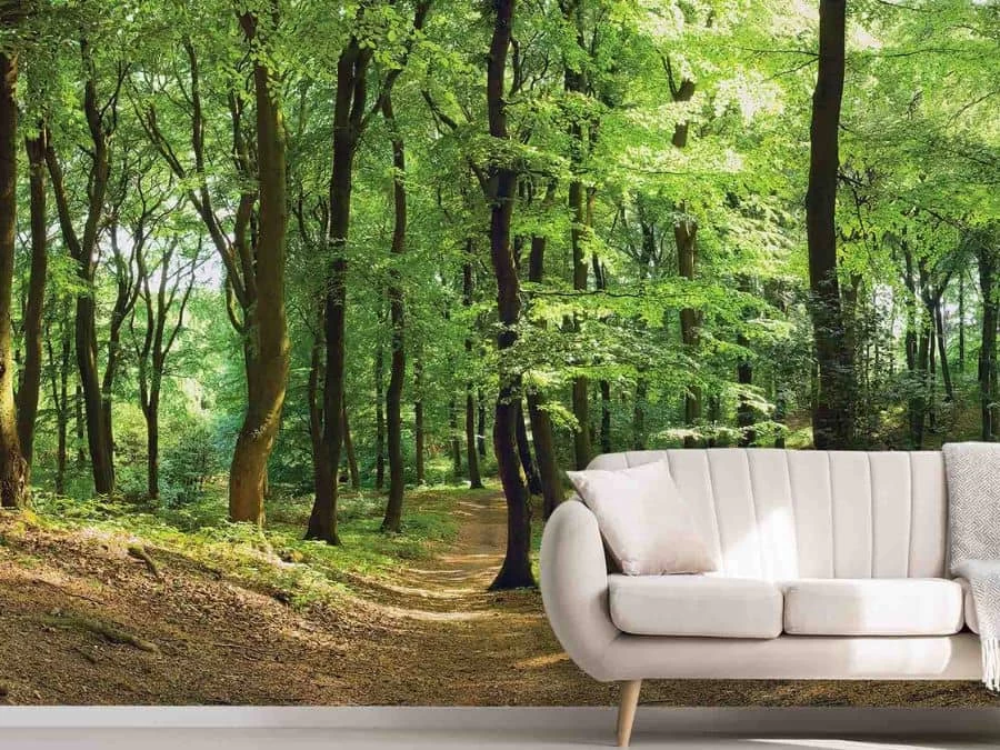 Hiking Trail Wallpaper adds a natural feeling to walls with its view of a small path in a peaceful forest. Created from a photo, it captures tall green trees lining the walking path. Youâll want to step into the wall mural and trek the landscape. Itâs: