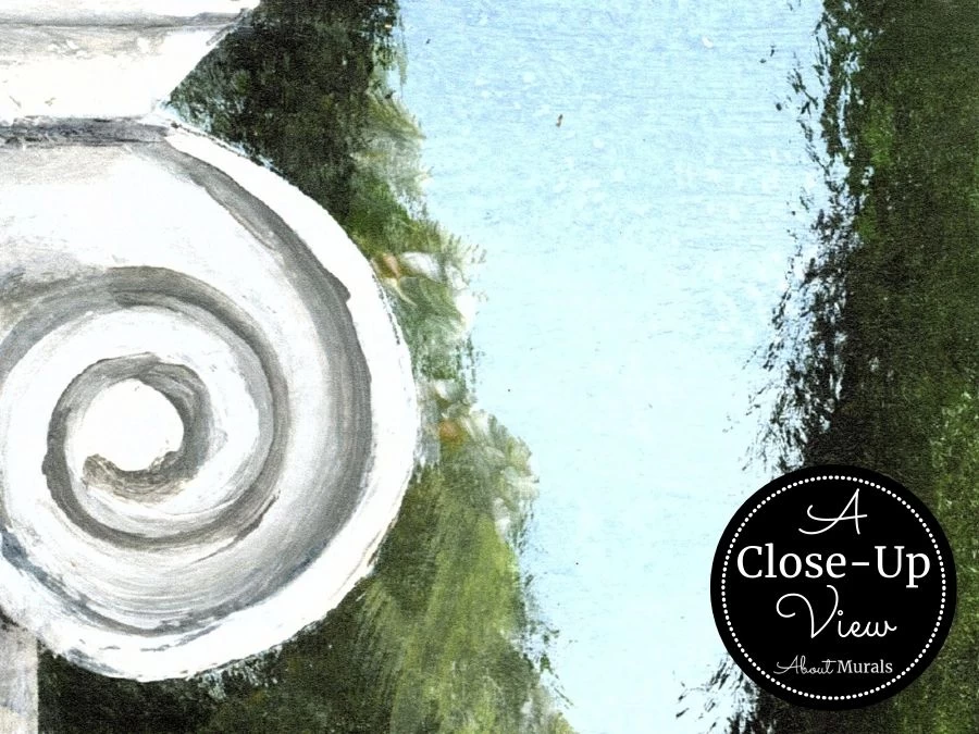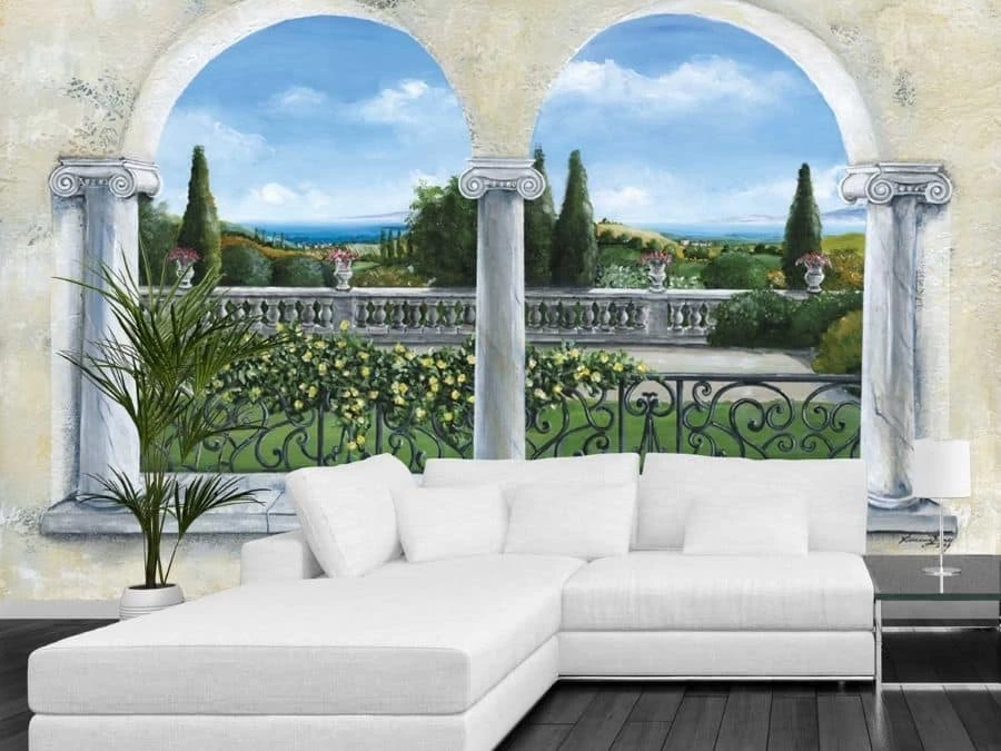 Italian Garden Wallpaper adds a luxurious feeling to walls with its view out of an Italian villa. Created from a painting by a Canadian artist, it’s scanned at high resolution and printed onto wallpaper. It captures two arch windows made of venetian plaster looking out onto a garden with cypress trees, plants and flowers. This wall mural is: