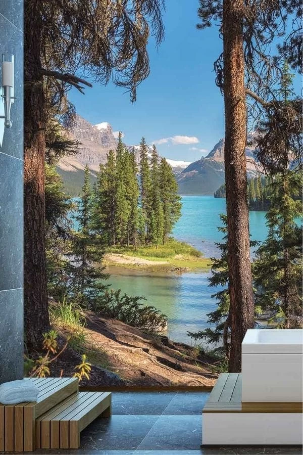 Jasper Wallpaper creates beautiful walls with its view of the Rocky Mountains and pine trees in Jasper National Park, Alberta. Created from a photo, it captures Spirit Island in the middle of Maligne Lake from behind a forest. It’s cherished by people who love to hike, climb or nature lovers. The mural is: