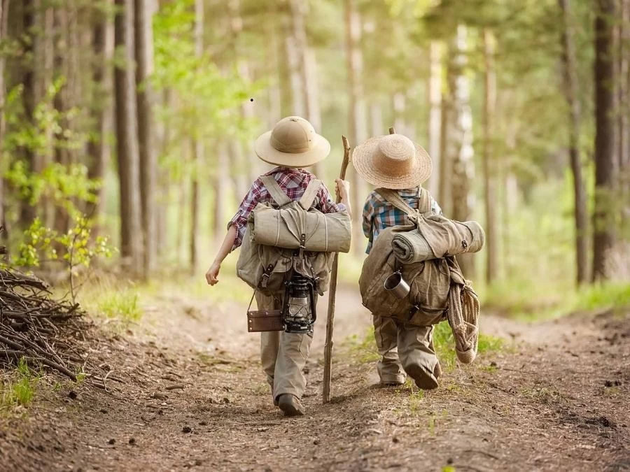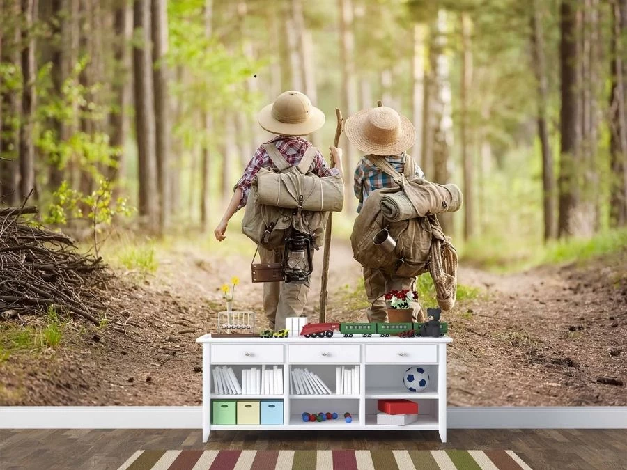 Kids Hiking Wallpaper adds a cute feeling to walls with its view of two children walking on a forest trail with camping gear like a lantern, rope, sleeping bags and hiking sticks. Created from a photo, it captures the youngsters ready to set up camp in the green woods. This wall mural is:
