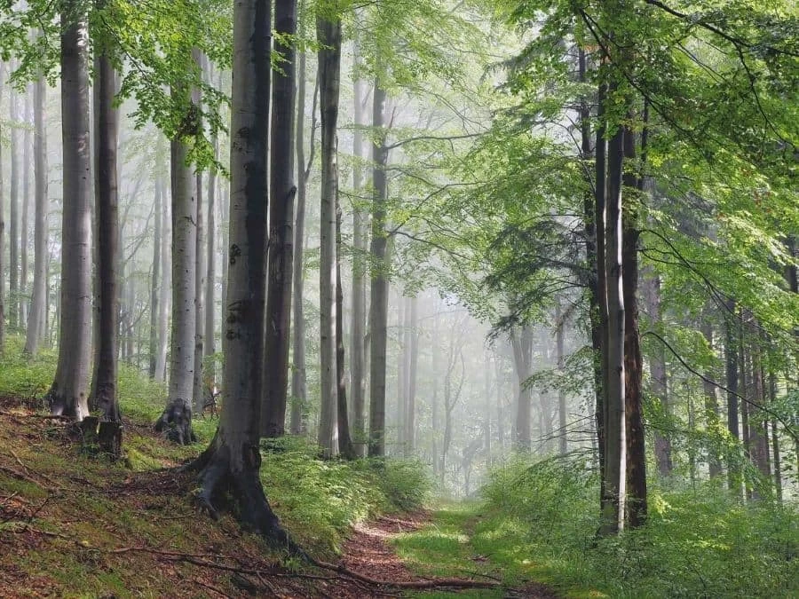 Large Forest Wallpaper adds a mysterious feeling to walls in summer at dawn in a beech forest. Created from a photo, it captures tall green trees lining a path leading towards a foggy background. You’ll want to step into this beautiful nature scene and hike the old trail. This wall mural is: