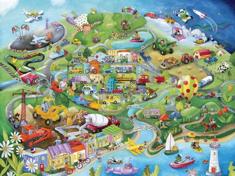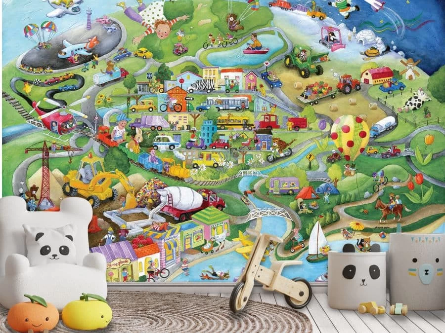 Leonard on Board Wall Mural keeps your kids occupied for hours as they find new scenes in this transportation wallpaper. They explore a city by plane, train and automobile…along with space ship, submarine, sail boat, helicopter, bicycle and hot air balloon.