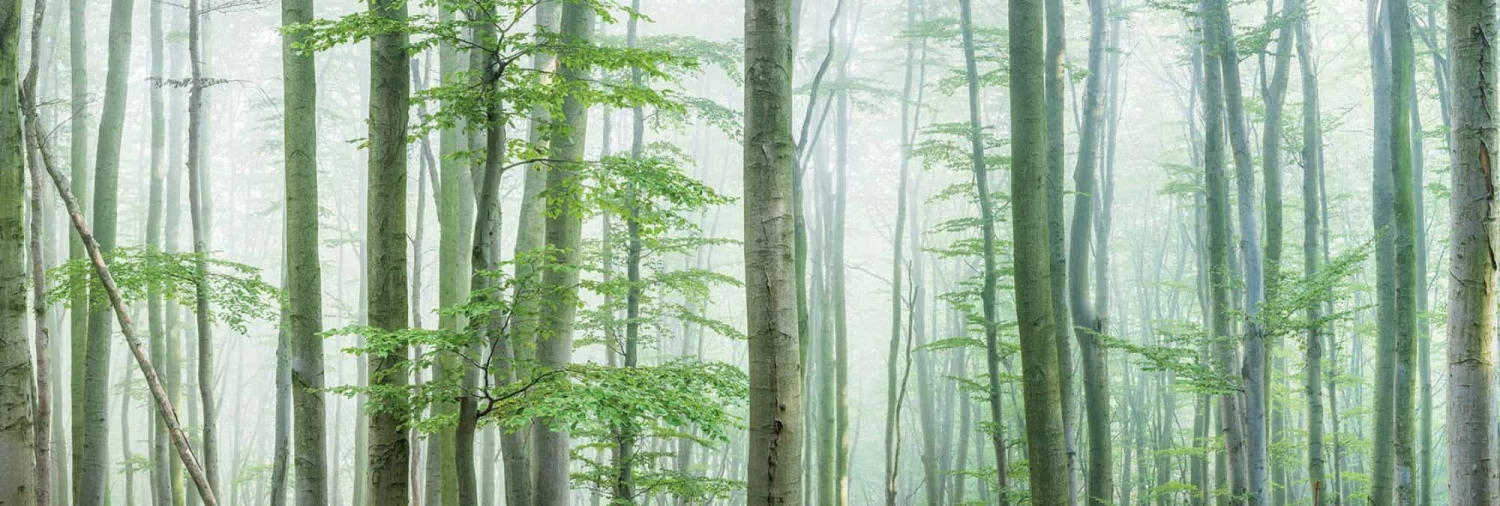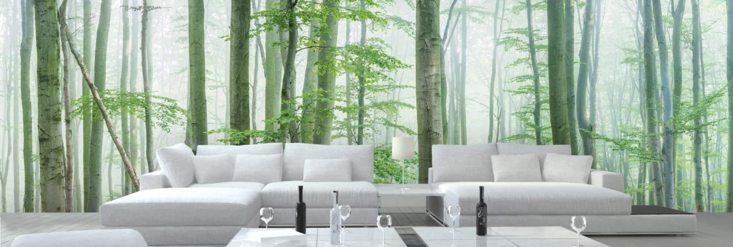 Light Green Forest Wallpaper adds an airy feeling to walls with its view of a panoramic green forest against a white misty background. Created from a photo, it captures the light grey Beech trees quietly sitting in fog. The extra large size of this wall mural is ideal for one large wall or to wrap onto two, three or four walls. It’s: