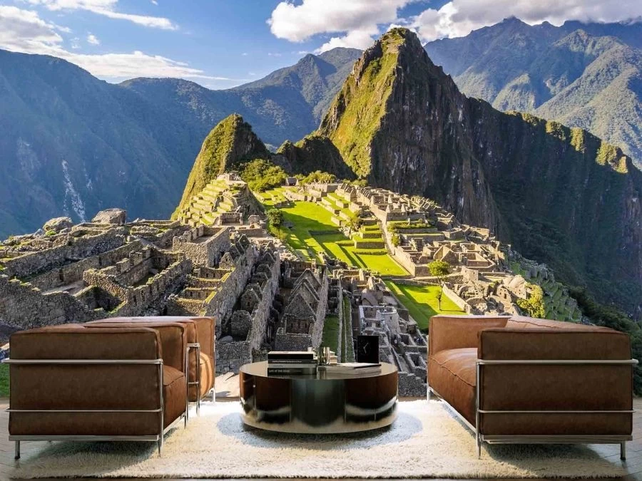 Machu Picchu Wallpaper adds a beautiful feeling to walls with its view of the Inca citadel in South America. Created from a photo, it captures the sun shining on a green mountain ridge under a cloudy, blue sky. The three structures within the citadel, called Intihuatana, the Temple of the Sun and the Room of Three Windows are all made in a polished dry stone. The Peru wallpaper is:
