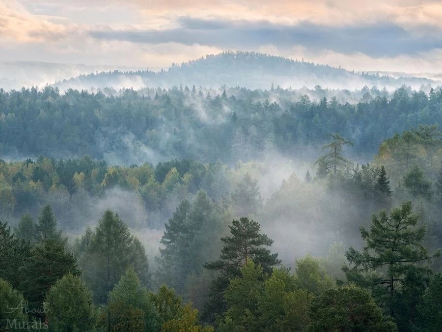 Misty Forest Wallpaper creates a moody backdrop on walls. The foggy forest wallpaper is created from a beautiful photo of grey fog settling over dark coniferous trees in Deer Streams Park, Yekaterinburg, Russia. You almost smell the lingering woodsy scent in the crisp air.