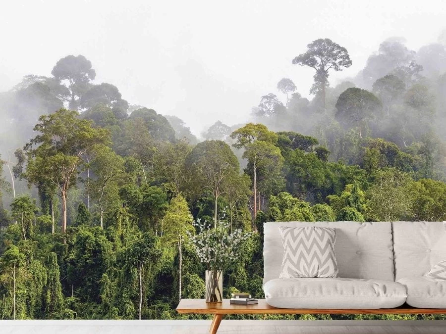 Misty Rainforest Wallpaper adds a mysterious feeling to walls with its view of a tropical forest covered in fog near the Malaysia-Kalimantan border. Created from a photo, it captures trees in the foggy landscape on a white, cloudy morning. This wall mural is: