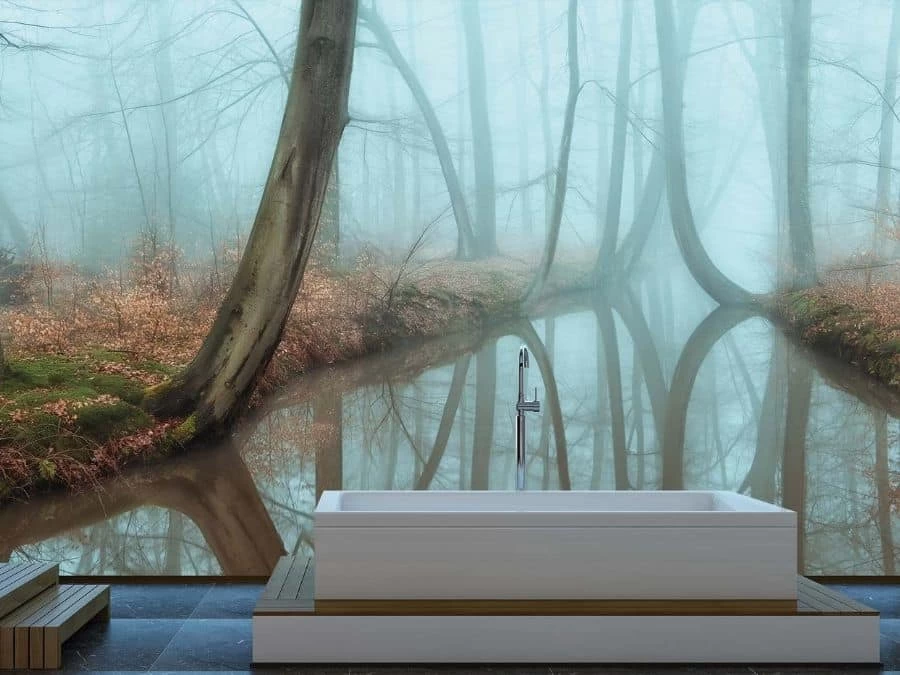 Nature Forest Wallpaper adds a peaceful feeling to walls with its view of bare autumn trees reflected in a serene pond. Created from a photo, it captures fall foliage and decaying leaves in the blue misty forest. This wall mural is: