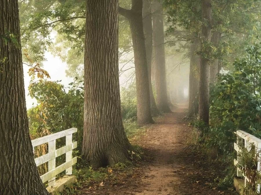 Nature Trail Wallpaper adds a peaceful feeling to walls with its view of a path in the mist. Created from a photo, it captures a foggy tree lined trail enclosed with a white gate. You’ll want to step into this misty landscape and hike the forest. This mural is: