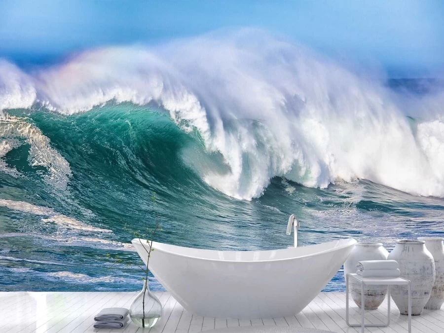 Ocean Wave Wallpaper is cool with its large, teal crashing wave. Created from a photo, it captures the lip of white water curling over the turquoise tube. A surfing enthusiast can imagine the misty spray and smell of salty sea water. The mural is: