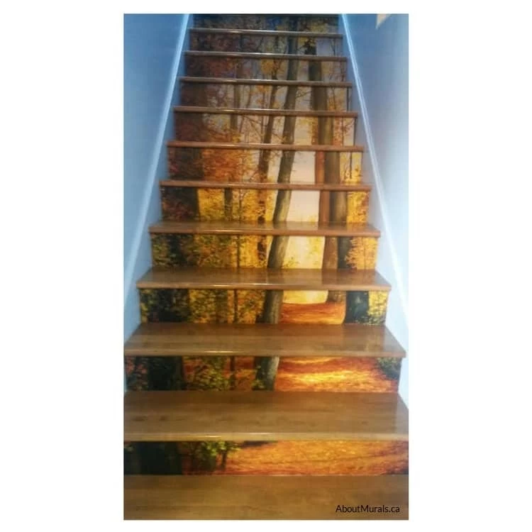 The orange forest wallpaper comes in 3 panels of 18Ⳡwide each by 8Ⲡhigh. Since every set of stairs has its own unique measurements, you simply cut the height and width you need for each stair riser and hang it like you would on a wall.