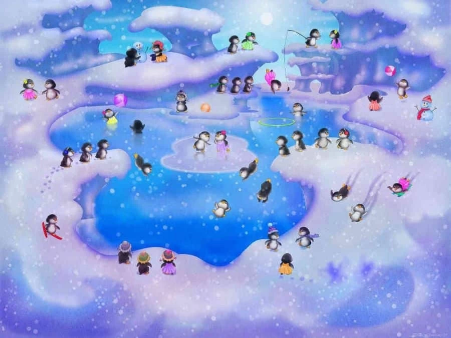 Penguin Wall Mural creates a cool room with adorable birds skating on ice, tobogganing, skiing, fishing and swimming in a blue winter wonderland. Children love finding new characters in the snow in this kids wallpaper. Created by a digital artist, this penguin wallpaper is created from an illustration thatâs printed on removable wallpaper. Itâs: