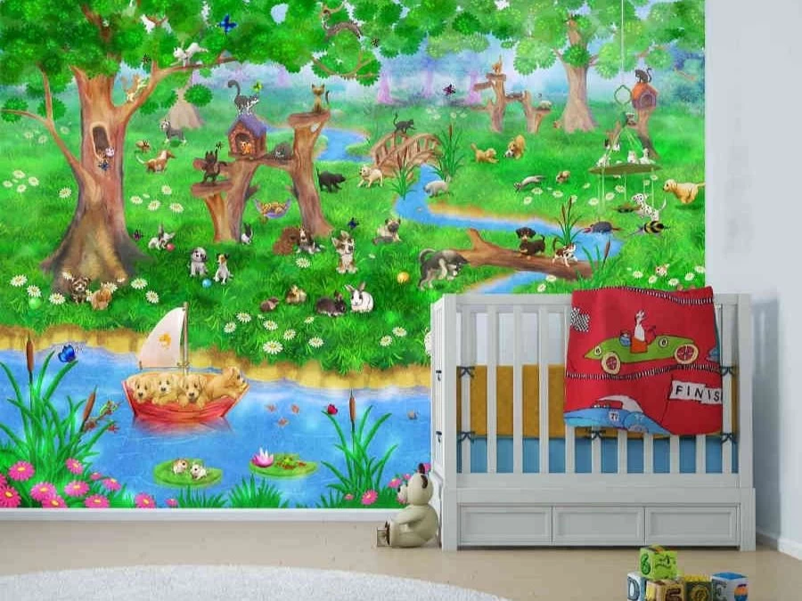 Pet Wallpaper gives your kids furry friends to say goodnight to before bed. Dogs, cats, bunnies and birds look adorable as they play in a green grassy forest. Puppies sail past hamsters floating on lily pads in a lazy river. Kittens climb trees next to fluttering butterflies in this pet paradise. Originally created as an illustration by a Canadian digital artist, the pet mural is printed on removable wallpaper. It’s: