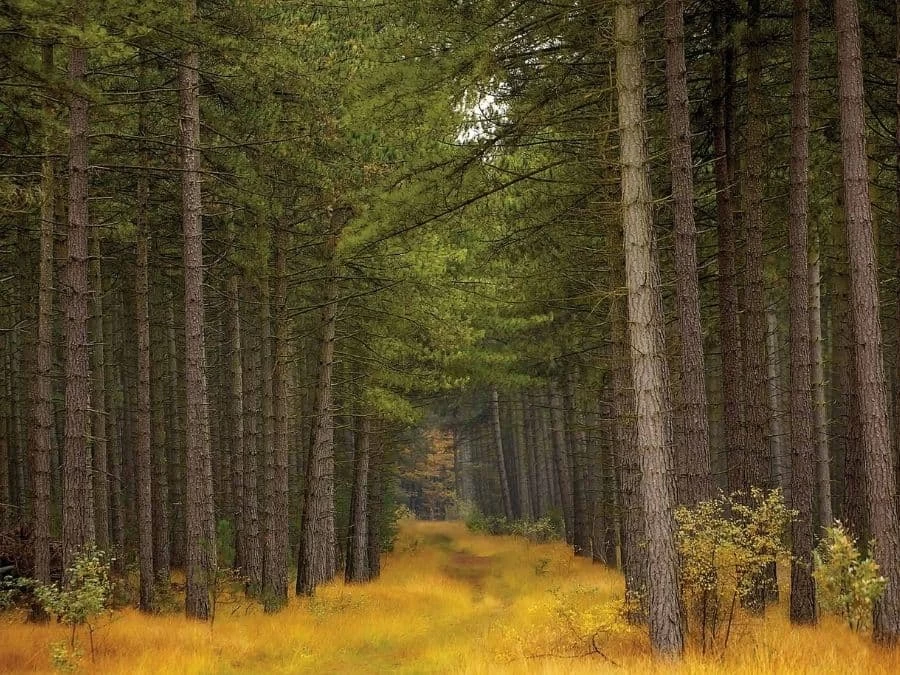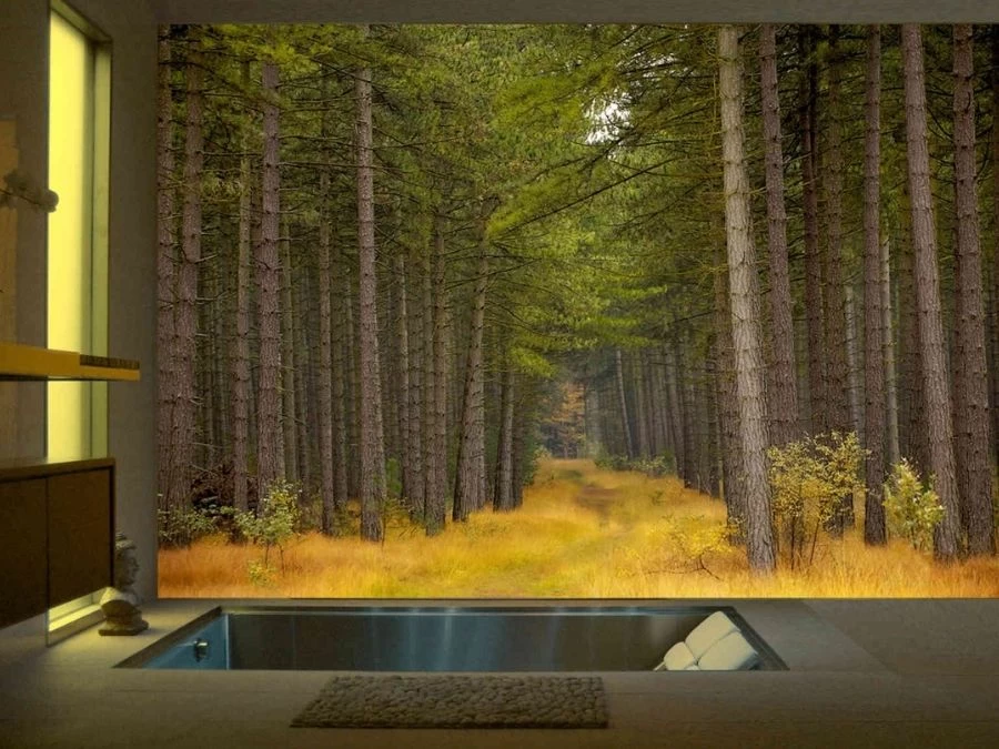 Pines Wallpaper evokes a strong yet peaceful feeling with its army of pines.  You almost smell the fresh scent and feel the crisp breeze blowing through the green forest in this pine tree wallpaper. Itâs created from a photo of majestic, textured evergreen tree trunks thatâs printed onto removable wallpaper. Youâll feel like stepping onto the golden yellow, grassy path and taking a hike through the pine tree mural. It makes your space feel bigger than it is. Itâs: