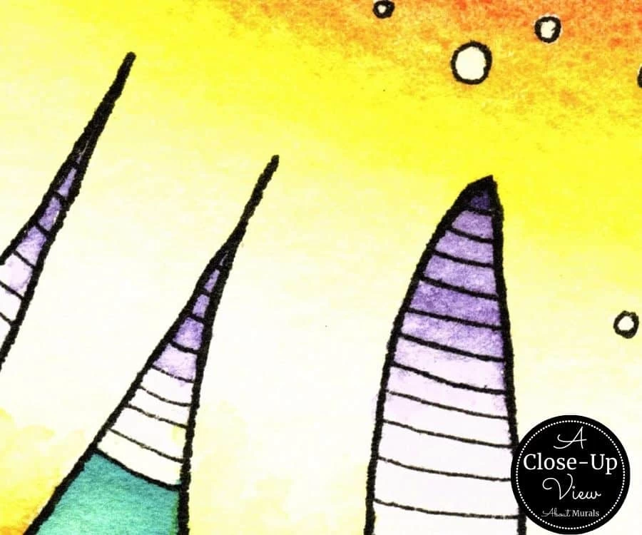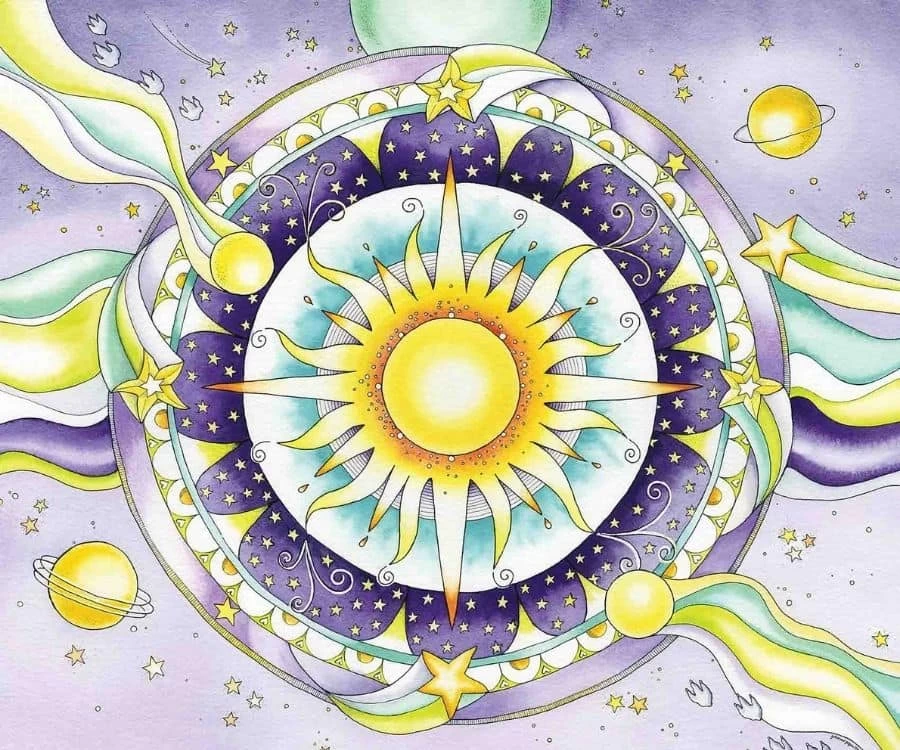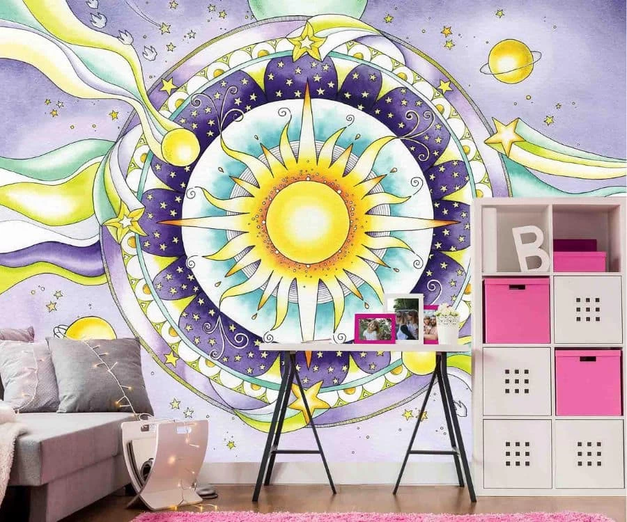 Purple Mandala Wallpaper adds a cute look to walls with its yellow sun, stars, planets and hearts on a round background. Created from a watercolor painting by a Canadian artist, it captures the geometric circle pattern in this galaxy design. It’s:
