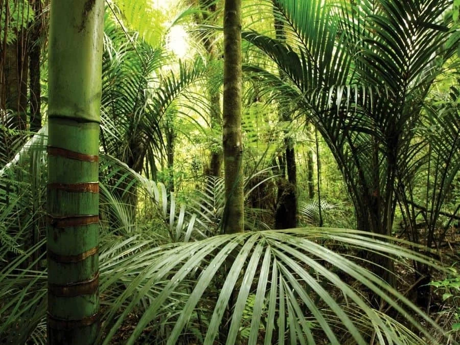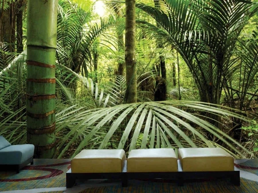 Rainforest Wallpaper adds a steamy feeling to walls with its view of a large bamboo tree and palm trees in a tropical jungle. Created from a photo, it captures the green nature scene decorated with large palm leaves and vibrant ferns. This wall mural is: