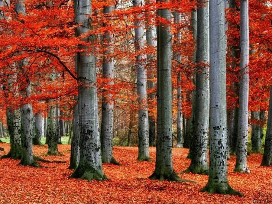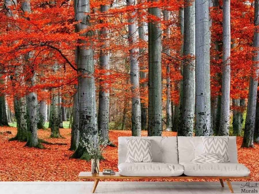 Red Forest Wallpaper, as seen on Cityline, adds a beautiful aesthetic to your room. Created from a photo, it captures vibrant red leaves peppering grey beech trees in the woods. You’ll want to step into this autumn forest wallpaper and stroll through the crisp nature scene. The forest wall mural adds depth to a room and is: