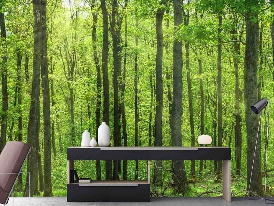 Relaxing Forest Wallpaper adds a peaceful feeling to walls with its view of a sunny forest on a spring day. Created from a photo, it captures subtle sunbeams shining through vibrant green trees in a calm landscape. Along with standard sizes, this wall mural is available in panoramic sizes ideal for a wide wall or to wrap around two, three or four walls. It’s: