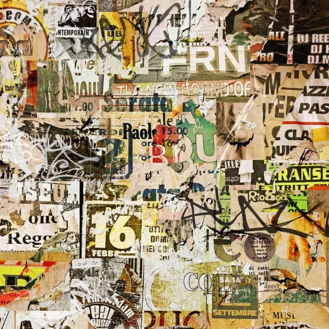 Retro Graffiti Wallpaper creates an urban feeling with its spray painted tags over a collage of street art. Created from a photo that’s digitally enhanced, it captures DJ, concert and dance club posters hung over each other, some torn and ripped. Black tagging is sprayed with illegible letters. This wall mural is: