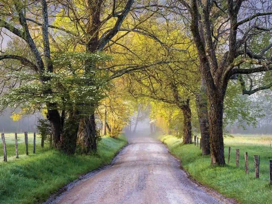 Road Tree Wallpaper adds a beautiful charm to walls with its country road stretching under an arch of yellow and green autumn trees. Created from a photo, it captures the nature scene with a field fence leading toward a foggy background in the distance. It’s: