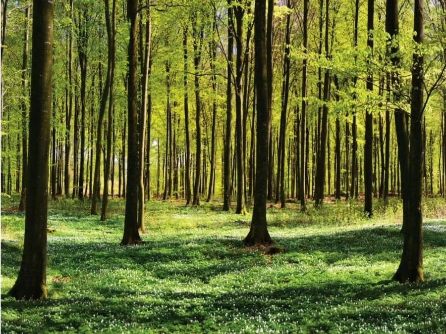 Shadows and Lights Wall Mural feels fresh and organic with its yellowy green trees. You almost feel the warm spring breeze on your face and smell the freshly blooming white flowers in this green forest wallpaper.
