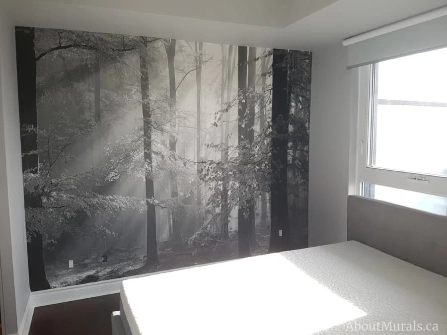 The black and white forest wallpaper is created from a high resolution photo of sunbeams streaming through trees. You’ll want to step into the grey forest wallpaper, soak up the sunshine and hike through the woods. The depth of the forest wall mural makes your room feel bigger than it is. It’s: