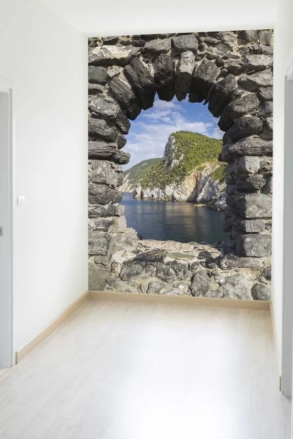Stone Arch Wallpaper adds a natural feeling to walls with its view of Gulf of the Poets, Porto Venere, Italy. Created from a photo taken by a Canadian photographer, it captures a window through an old stone wall looking out onto the water at Byronâs Grotto. The narrow size of this wall mural is ideal for a closet, door, nook or small wall. Itâs: