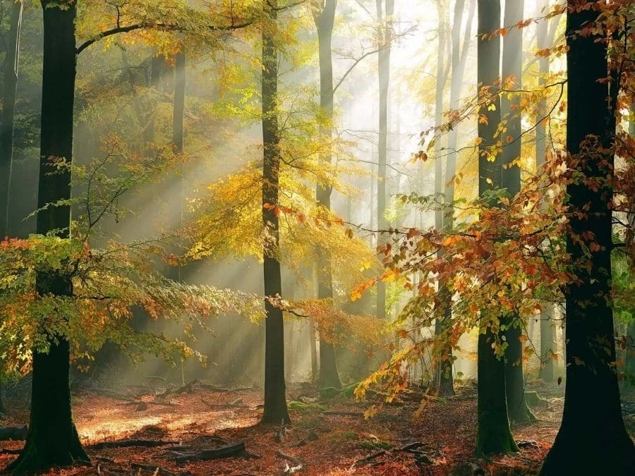 Sunny Autumn Wallpaper adds a beautiful aesthetic to walls with its view of sunbeams shining through yellow, moss-covered trees. Created from a photo, it captures all the texture of the autumn leaves glimmering in the sunshine. The bright scene in this fall forest wallpaper looks like a view out of a picture window, which adds depth to a room. You can almost smell the earthy scent of the woods. This fall wall mural is: